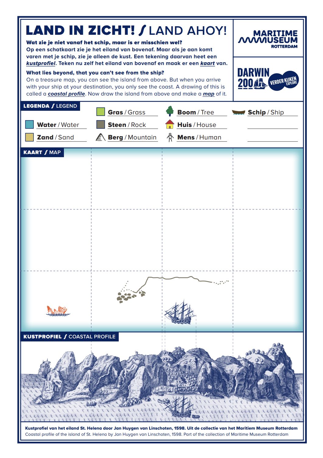 Wat zie je niet vanaf het schip, maar is er misschien wel? Op een schatkaart zie je het eiland van bovenaf. Maar als je aan komt varen met je schip, zie je alleen de kust. Een tekening daarvan heet een kustprofiel. Teken met ons Darwin werkblad nu zelf het eiland van bovenaf en maar er een kaart van!