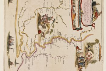- Foto 3: Gekleurde kaart van Suriname met vermelding van plantages, op basis van de getekende kaart door landmeter Willem Mogge, 1677 | Fotograaf onbekend